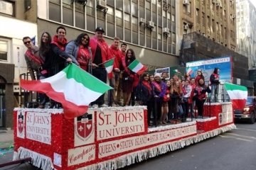 In celebration of the 72nd annual New York City Columbus Day Parade, 40 St. John’s students represented the University with a decorated float in part of its Rock the Red Initiative.